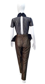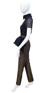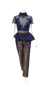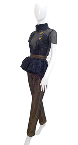 - Bottom: narrow-leg cut trousers in silk and net with floral patch applications.