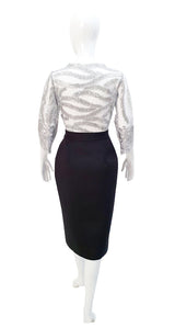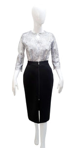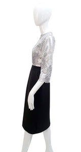 Vestido de corte clásico de la colección COLORFULGLAM, donde priman la comodidad y el color. Una mezcla de materiales como el neopreno y el encaje de lentejuelas, donde el neopreno es un precursor en las prendas prêt-à-porter, aportando la sensación de comodidad de la ropa deportiva, en un estilo totalmente chic y elegante.